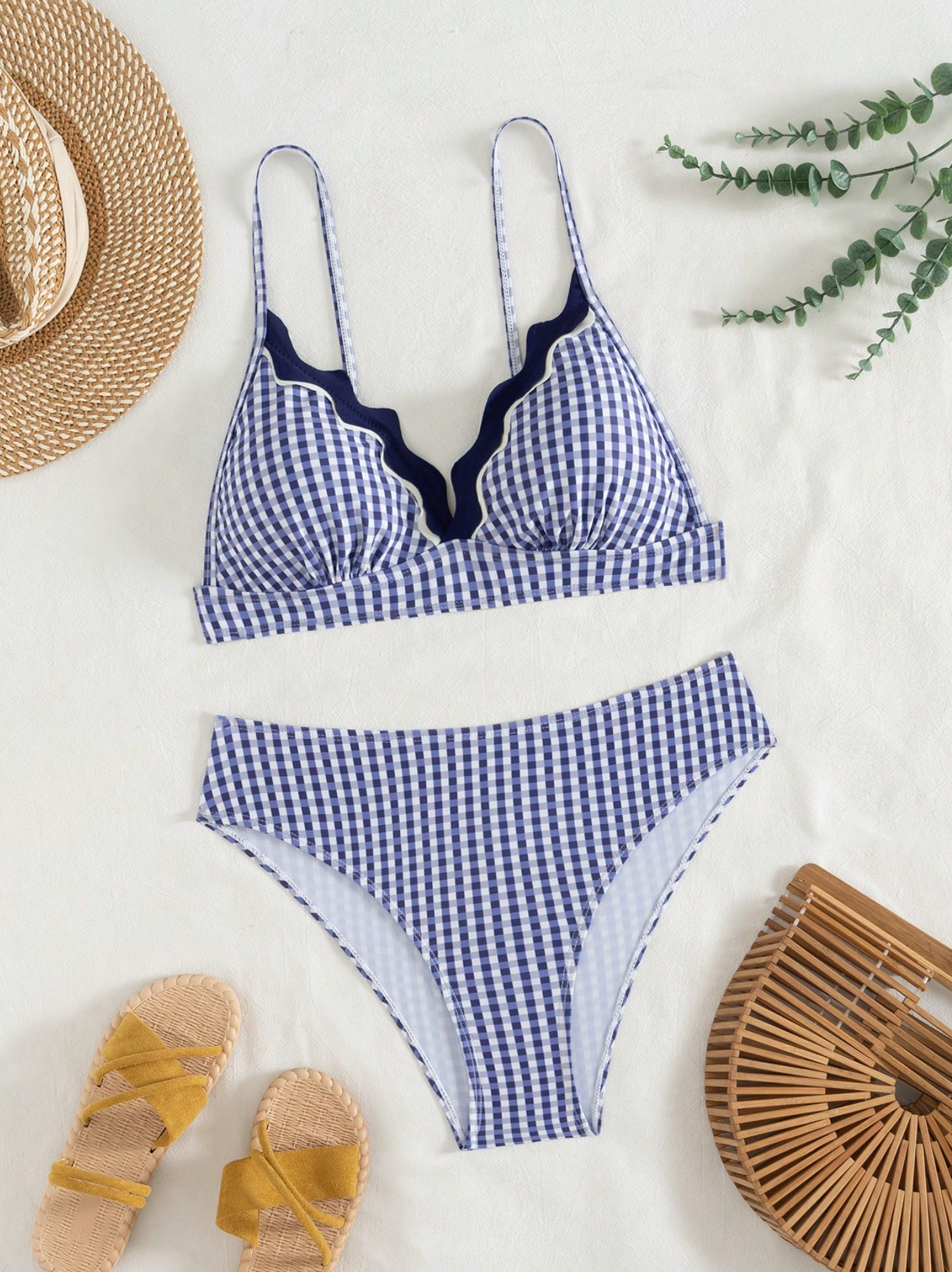 Make a statement this summer with our Navy White Gingham Print Scallop Trim Bikini Set! This playful set features a classic print and cute scallop trim, perfect for a day at the beach or pool. Embrace your inner fashionista and stand out in this must-have swimsuit!