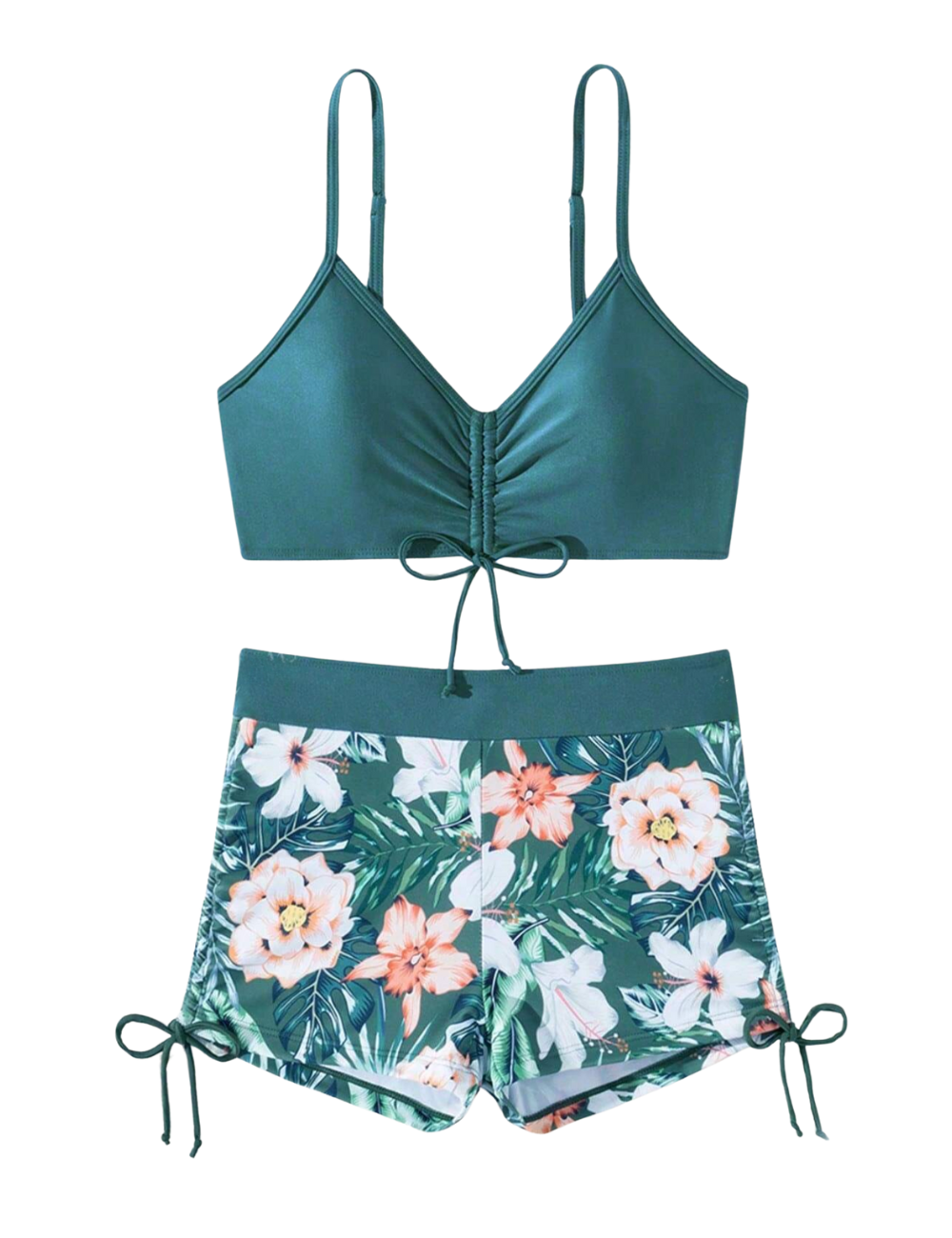 Teal & Tropical Ruched Drawstring Bikini Shorts Set