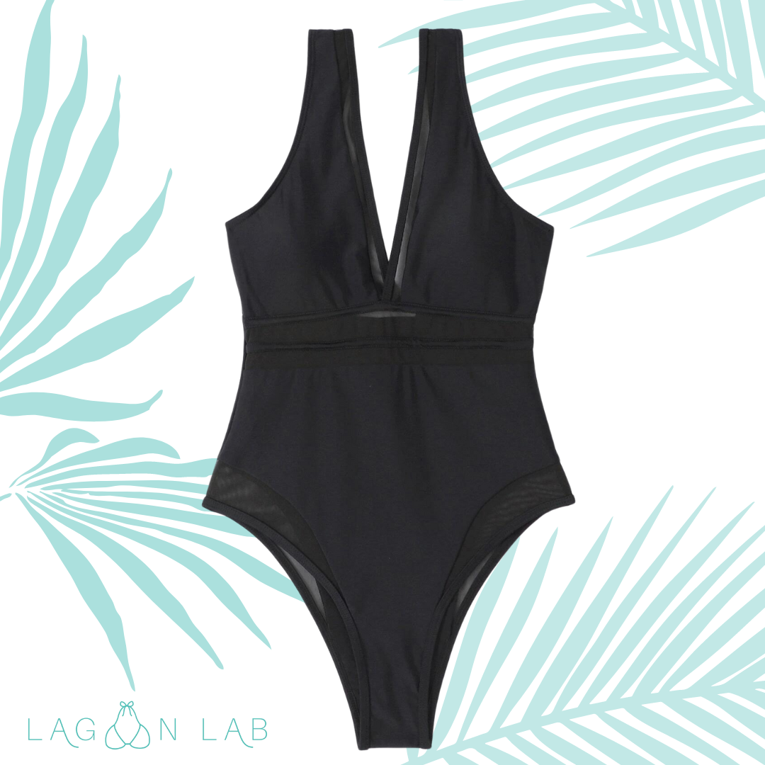 Put on this classic one piece swimsuit and dive in! Feminine mesh detail give this one piece a flattering fit, while the plunging neckline and backless design add to the glamour of this piece. Style Tip: Wear it with a stylish kimonos and denim shorts.