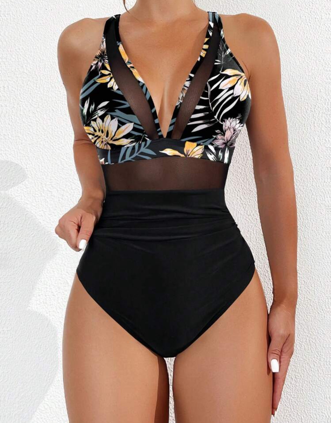 Tropical & Black Mesh Tummy Control Plunge One Piece