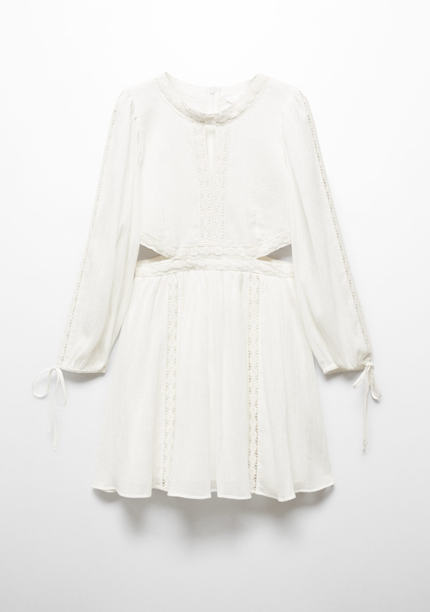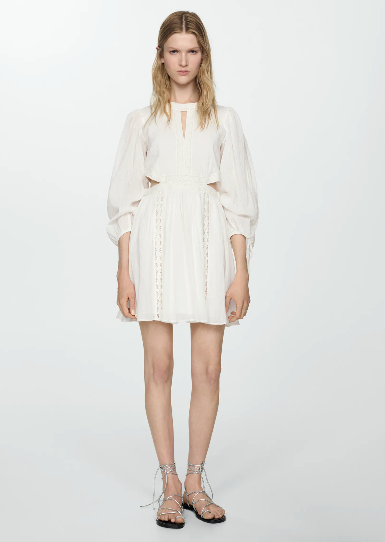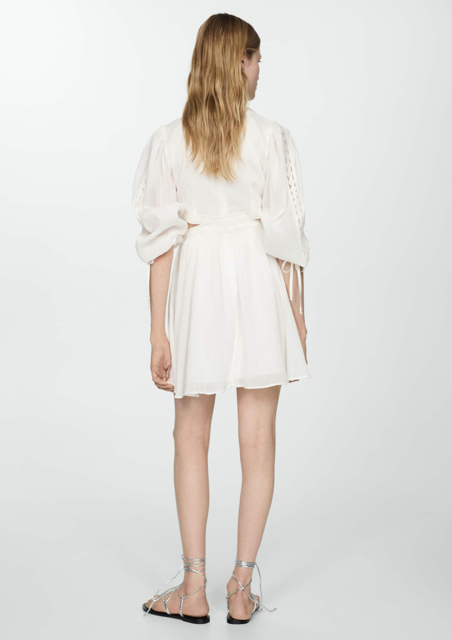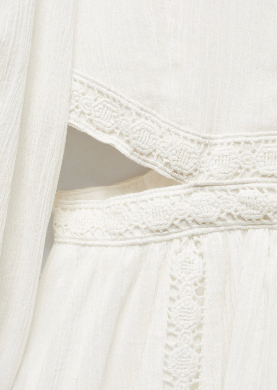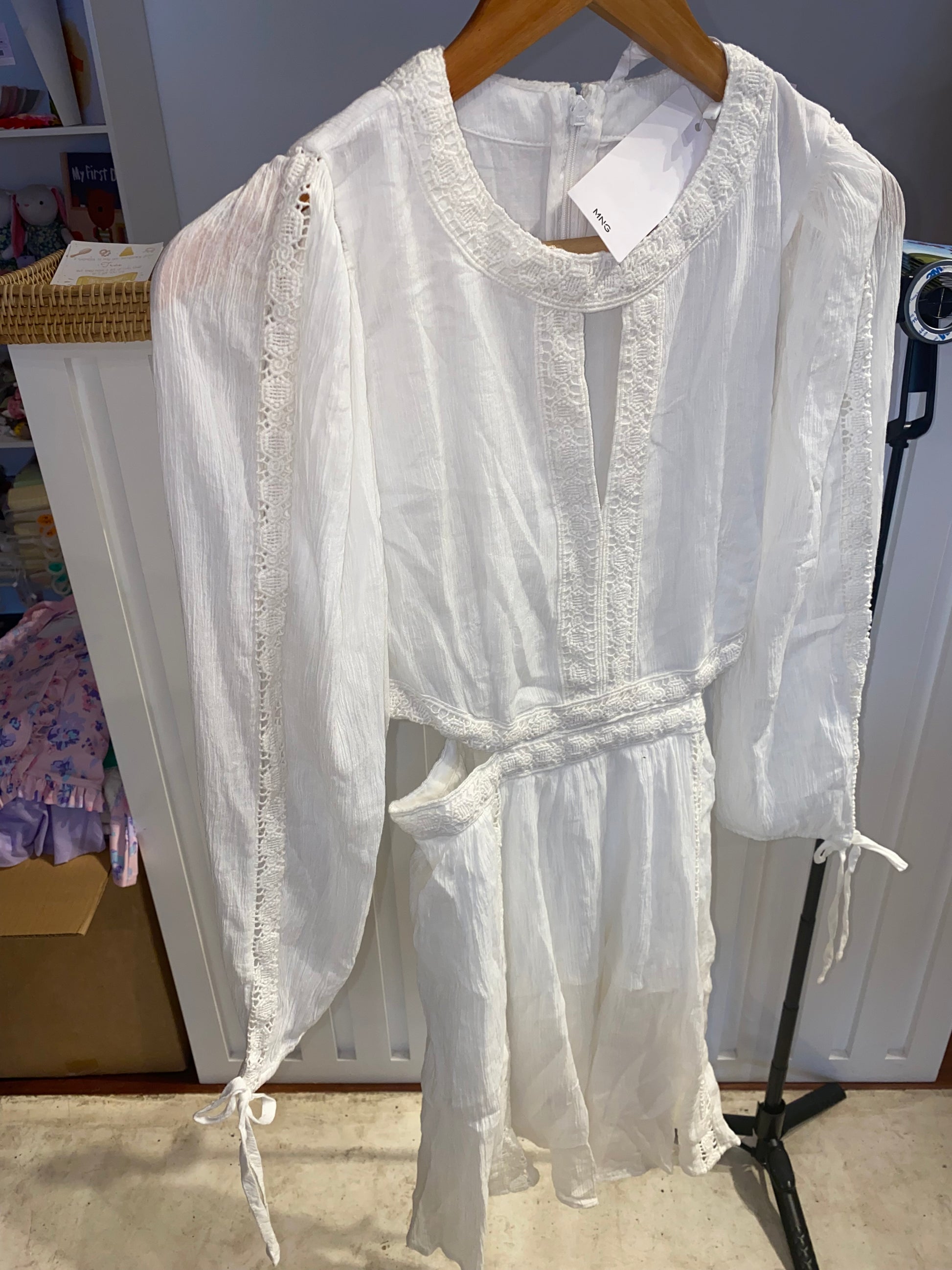 100% cotton fabric. Straight design. Short design. Round neck. Long puffed sleeves. Cuff ties detail. Lace trim
